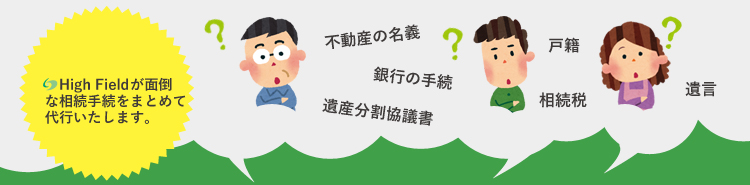 当サイトを運営するハイフィールドグループでは、弁護士、司法書士、行政書士、税理士が連携しながらお客様の家族になったつもりで親身に相続手続をお手伝いいたします。